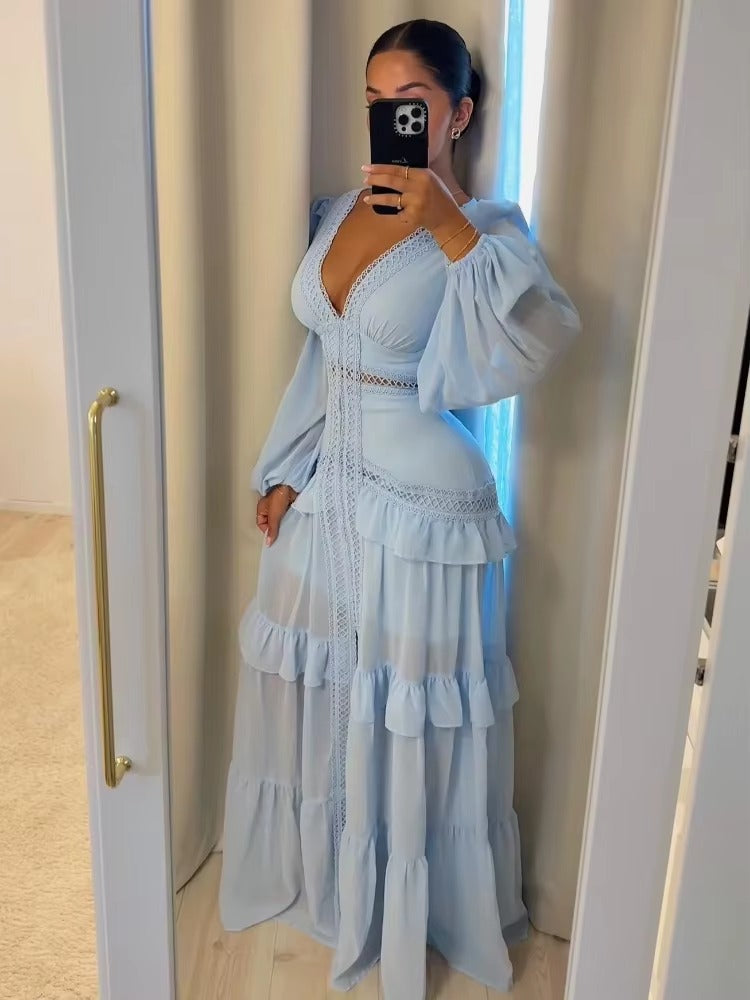 Transform your closet with the Chic Maxi Dress With Long Sleeves And Ruffles. This maxi dress is the ideal choice for those looking for a sophisticated piece full of charm. With long sleeves and delicate ruffles, it offers a romantic and elegant touch.