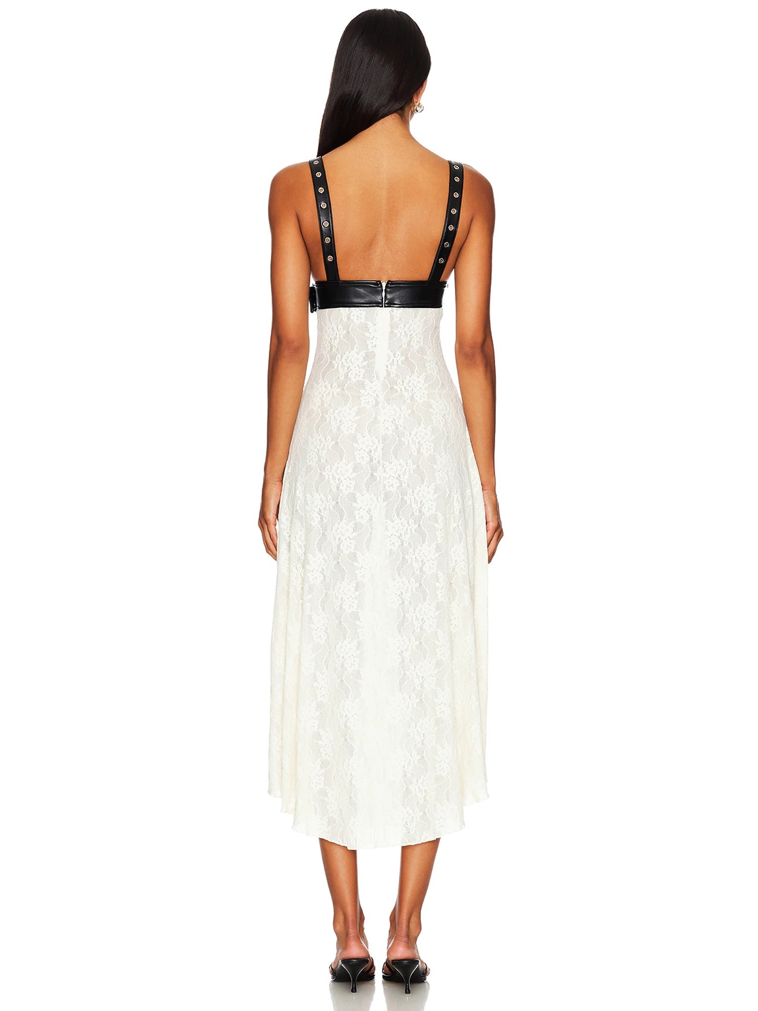 This Floral Lace Midi Dress seamlessly combines romance with modern design. The exquisite floral lace fabric adds a touch of elegance, while the faux leather bodice exudes a luxurious flair. The dress features a comfortable partial lining, ensuring an all-day wearability, and a concealed back zipper for a sleek, streamlined silhouette. Adjustable shoulder straps provide a personalized fit, while the included belt enhances the waistline, adding a charming and fashionable detail. Whether for everyday wear or special occasions, this dress promises endless allure and confidence.