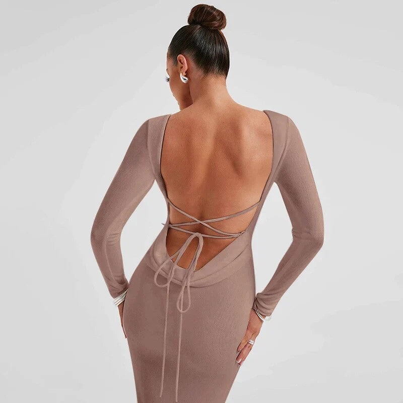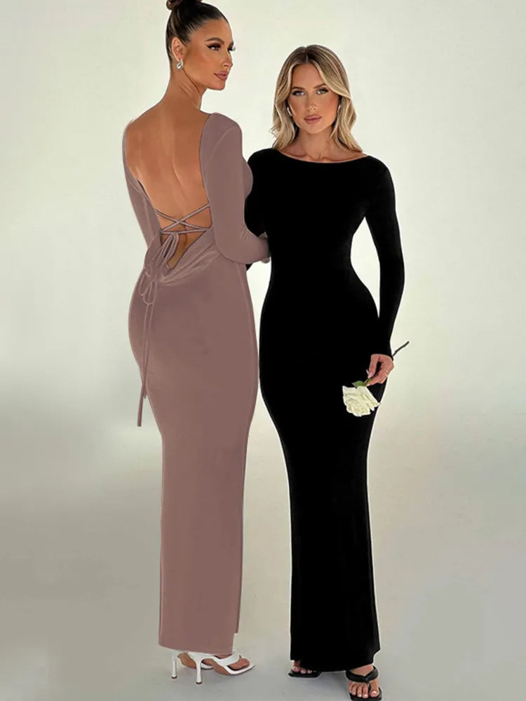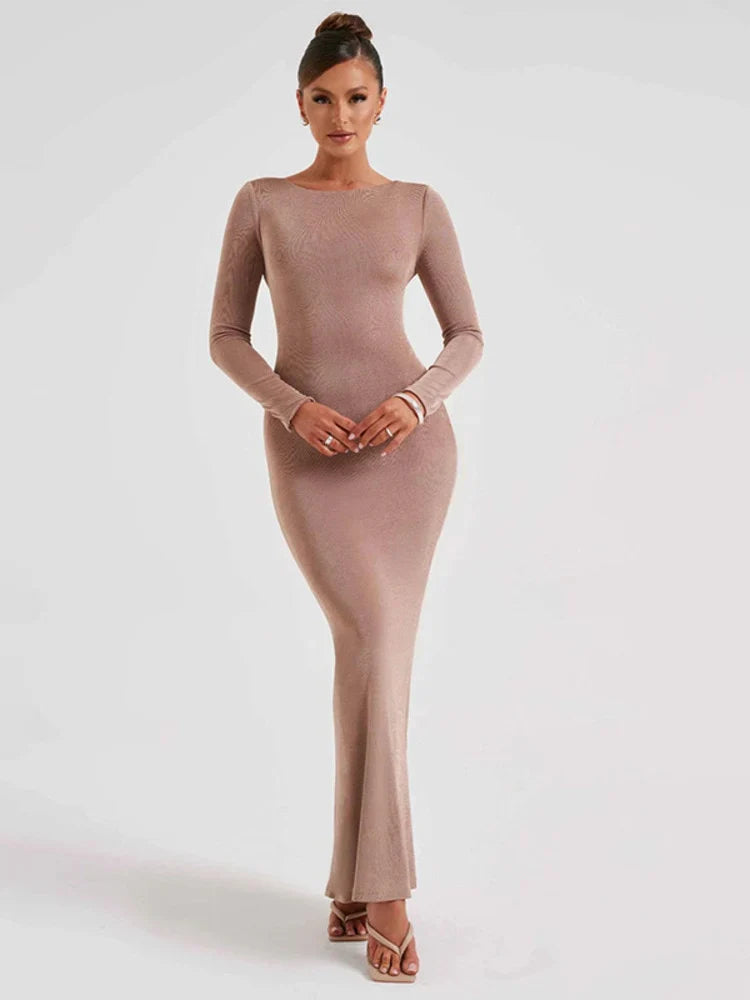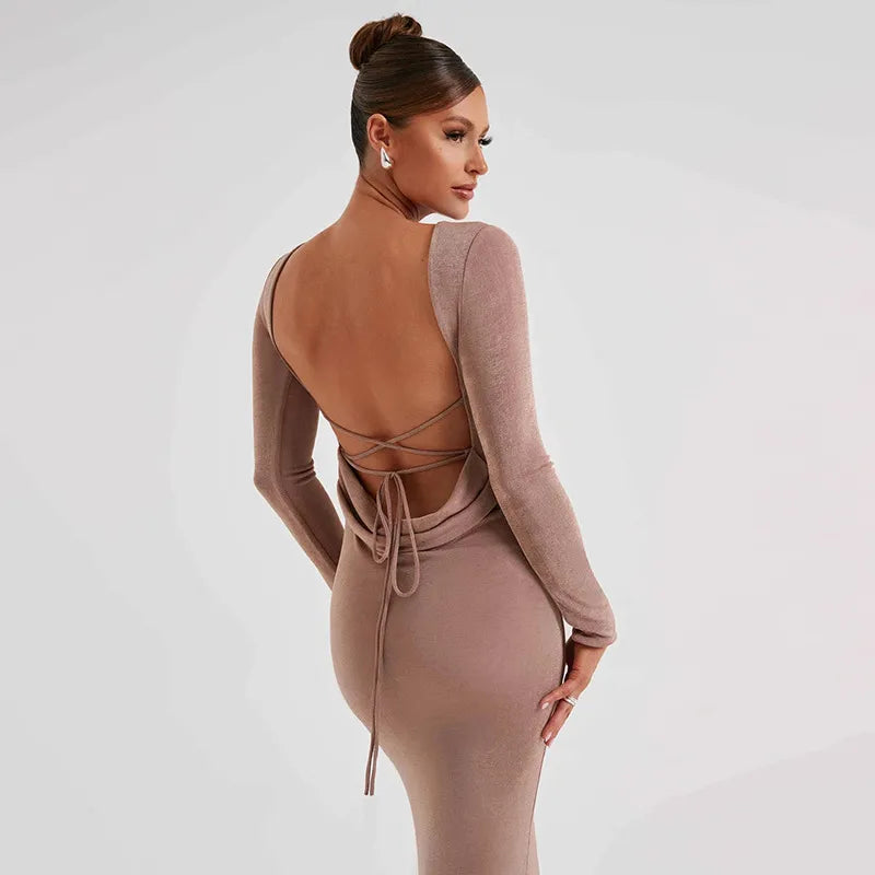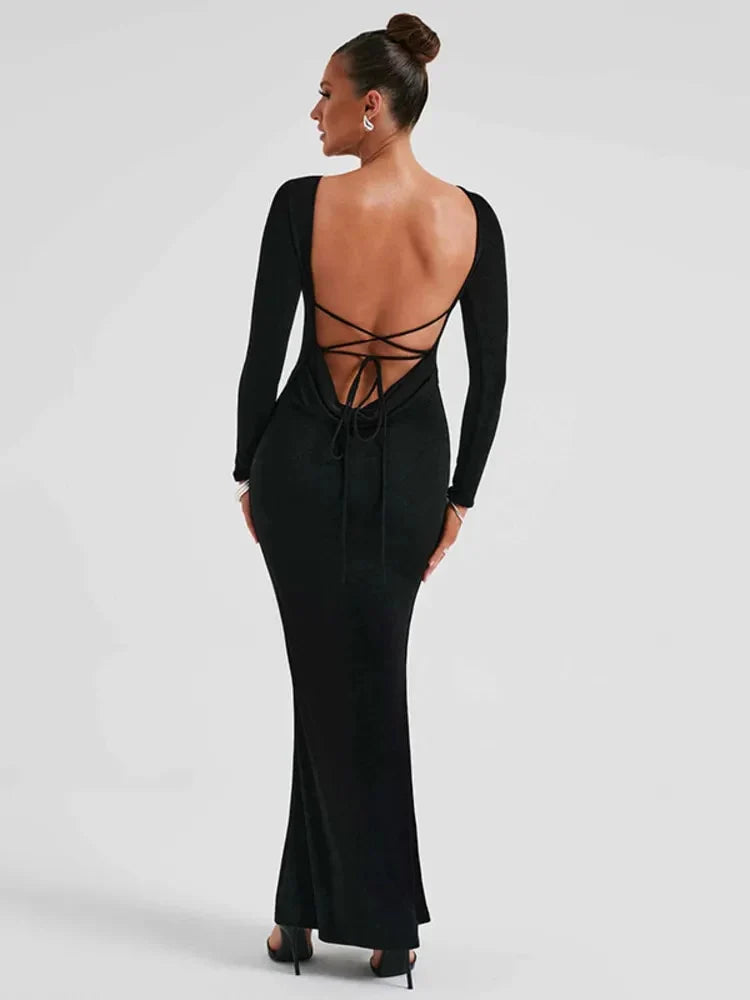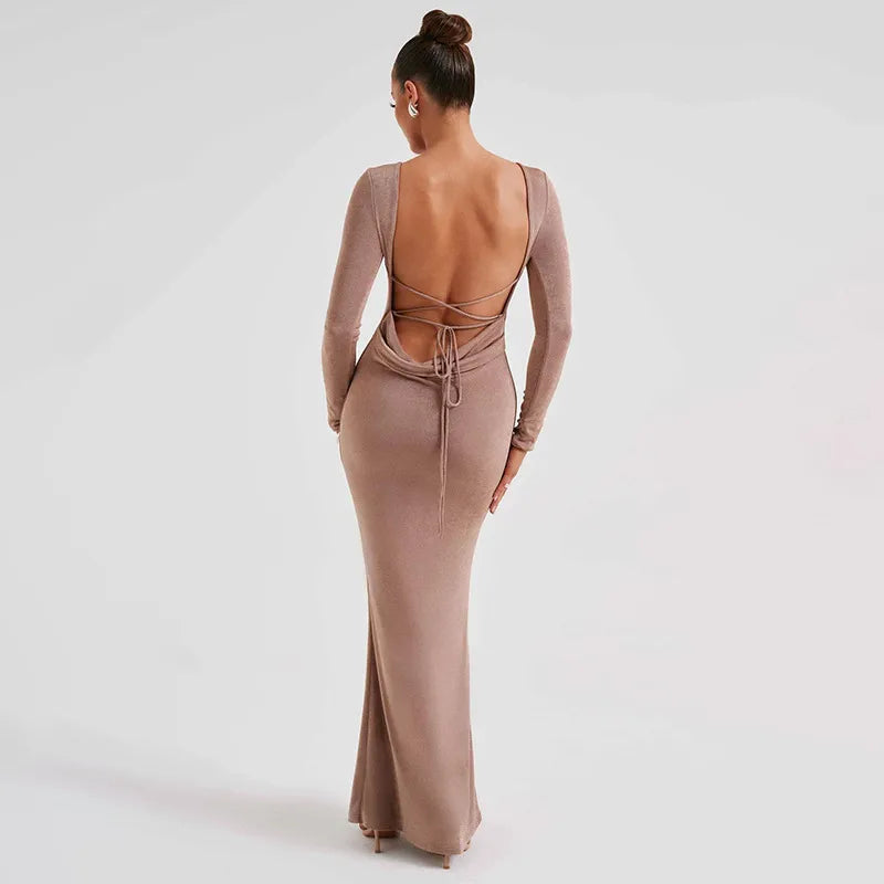Introducing our Serenity long-sleeved backless maxi dress, where grace meets allure in a harmonious blend of style and sophistication.