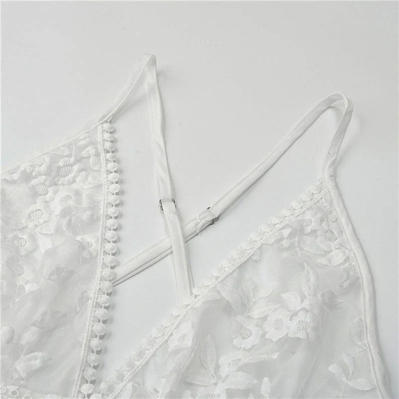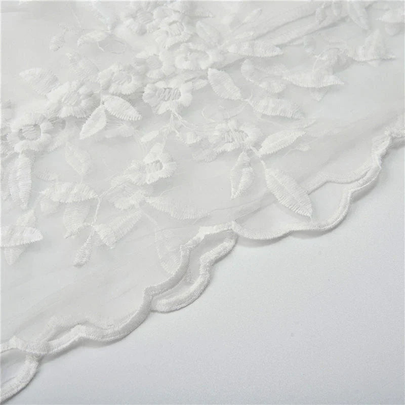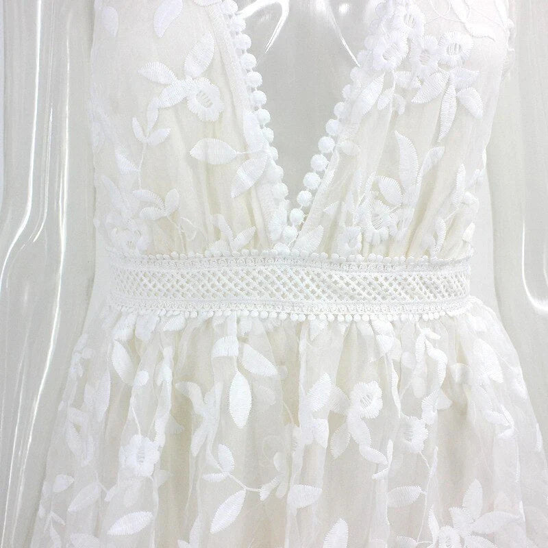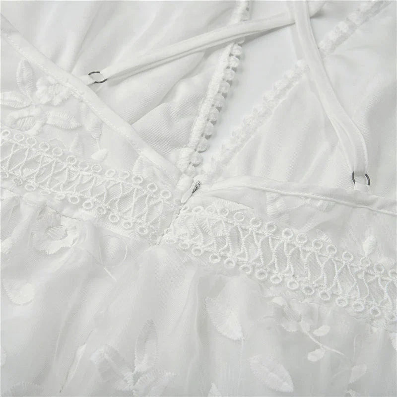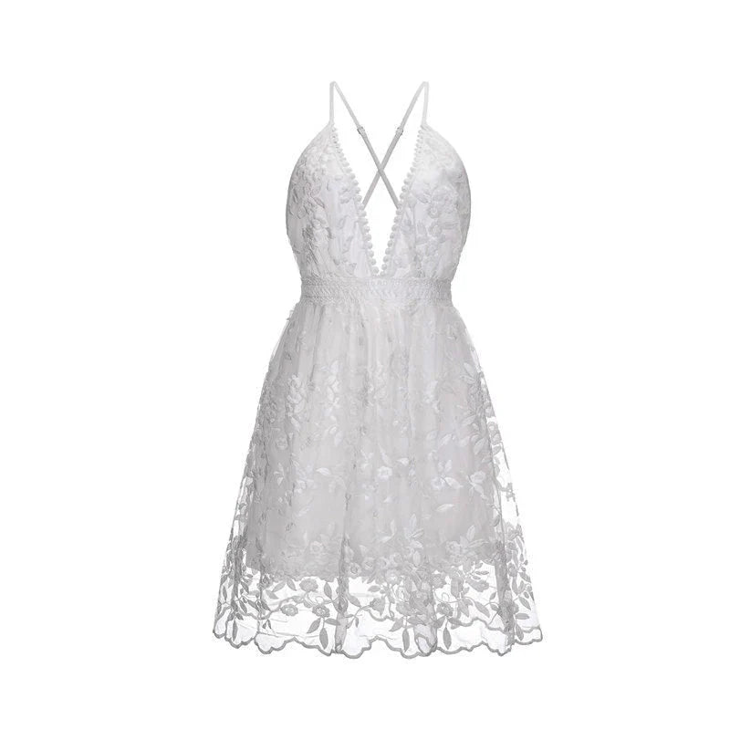 Don't forget to shine on New Year's Eve or any other summer festival. This short party dress is the ideal choice for these occasions, promoting an atmosphere of joy and elegance. Catch the eye and receive compliments with the White Embroidered Lace Short Party Dress. Get yours now!